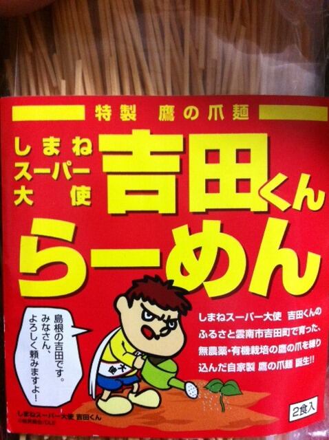 秘密結社「鷹の爪団」の吉田くんの故郷、島根県吉田町で、無農薬有機栽培で作られた鷹の爪が麺に練り込まれたら〜めんです。一袋に二食分(特製・塩とんこつスープ付)入っています。
